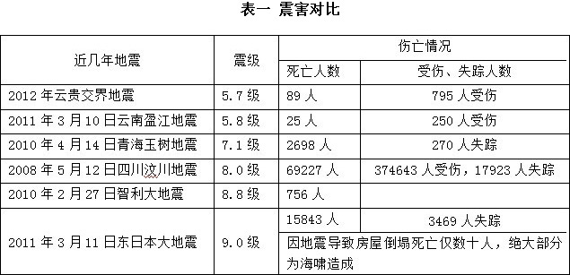 2012年9月7日,云南省昭通市彝良县与贵州省威宁彝族回族苗族自治县交界连续发生5.7、5.6级地震,造成大量人员伤亡。据初步调查,位于震中附近的云南省彝良县洛泽河、角奎两镇砖木结构、土木结构、石木结构房屋约占70%;砖混结构、框架结构房屋约占30%。彝良县内各乡镇设防烈度为Ⅴ度或Ⅵ度,而震区大量房屋为抗震性能差的土木和砖木结构,因而毁坏较为严重。