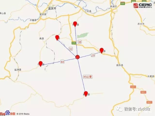 震中距兴文县29公里、距珙县32公里、距长宁县38公里、距筠连县44公里、距云南威信县45公里,距宜宾市64公里,距重庆市215公里